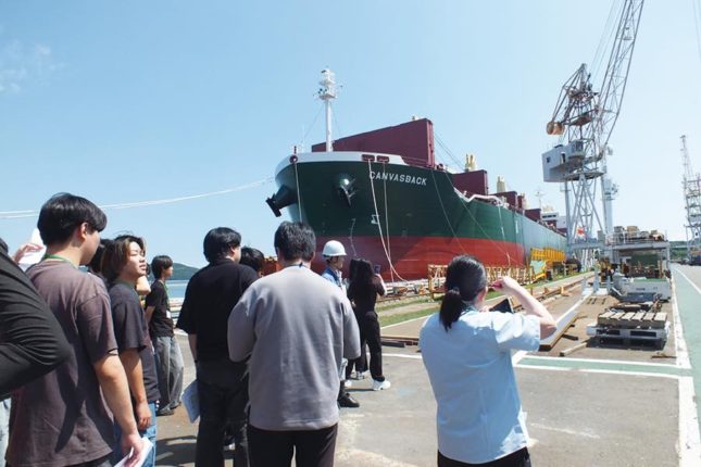 尾道造船㈱では、バスで新造船の建造現場を見学したのち、経理業務について、事前に学生から寄せられた質問に答える形で進められ、5期分の決算書をもとに、具体に経理の職種について学んだ。参加学生は「工場見学に伺った際、あまりにも規模が大きく驚いたと同時に、純粋にかっこいいと感じた」と話した。