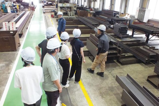 三和鉄構建設㈱尾道工場では、鉄骨部品の加工現場を見学。今春開業した広島駅の商業施設への納品実績も紹介され、参加学生は「今まで見てきた建物などの見方を改めることができた。社長の話が聞けてよかった」と話した。