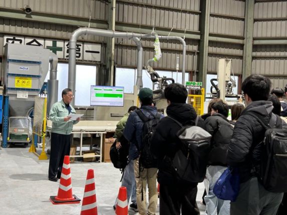 同イベントは、地域企業の現場を実際に見学し、学生と企業の直接交流を通じて、仕事への理解や就職への意識を高めることを目的とし、まず㈱ミヤジの見学からスタート。ものづくりの現場で働く人々の姿や、スマートフォンを使って機材を操作する最新の技術について説明を受け、学生たちは、興味深そうに話に耳を傾けていた。